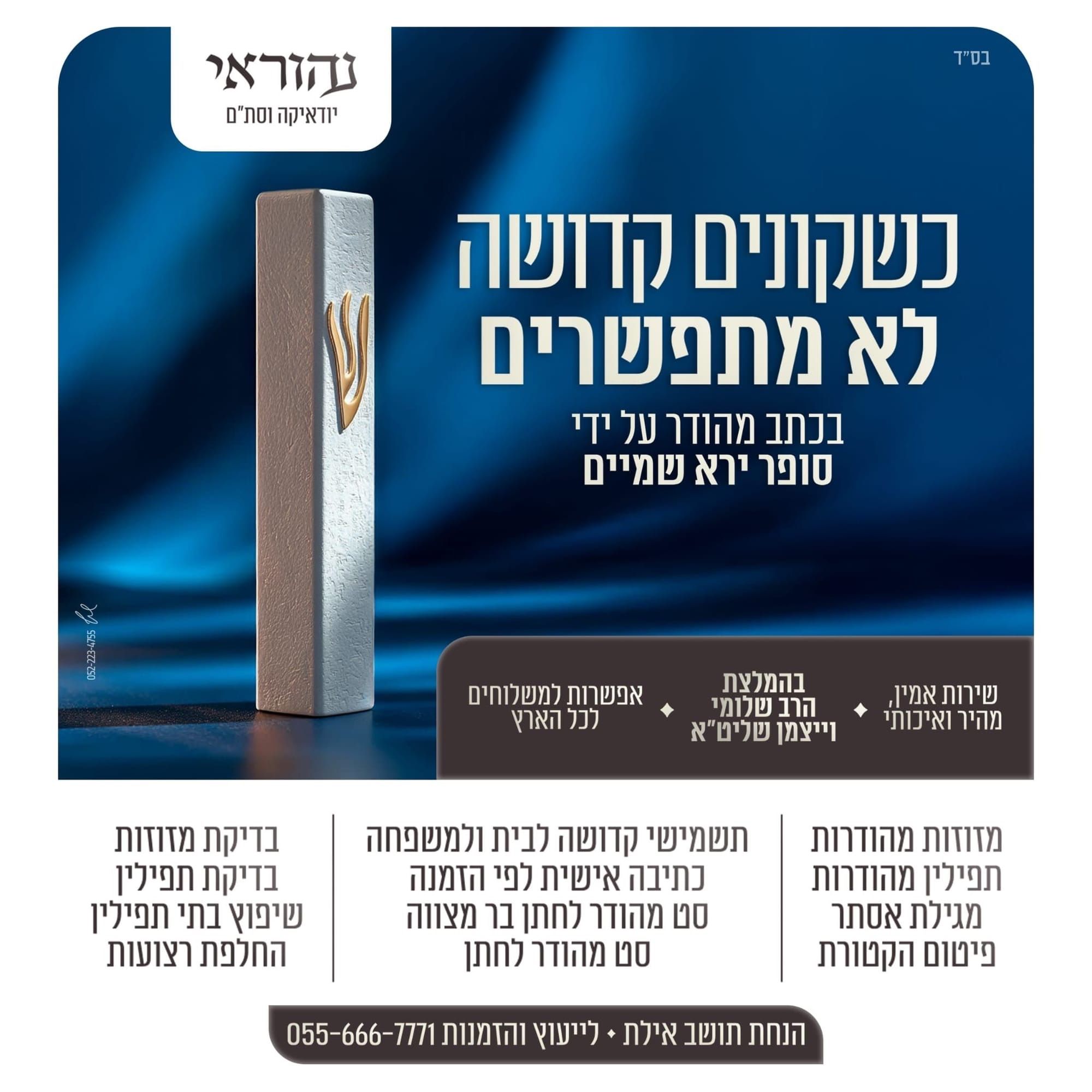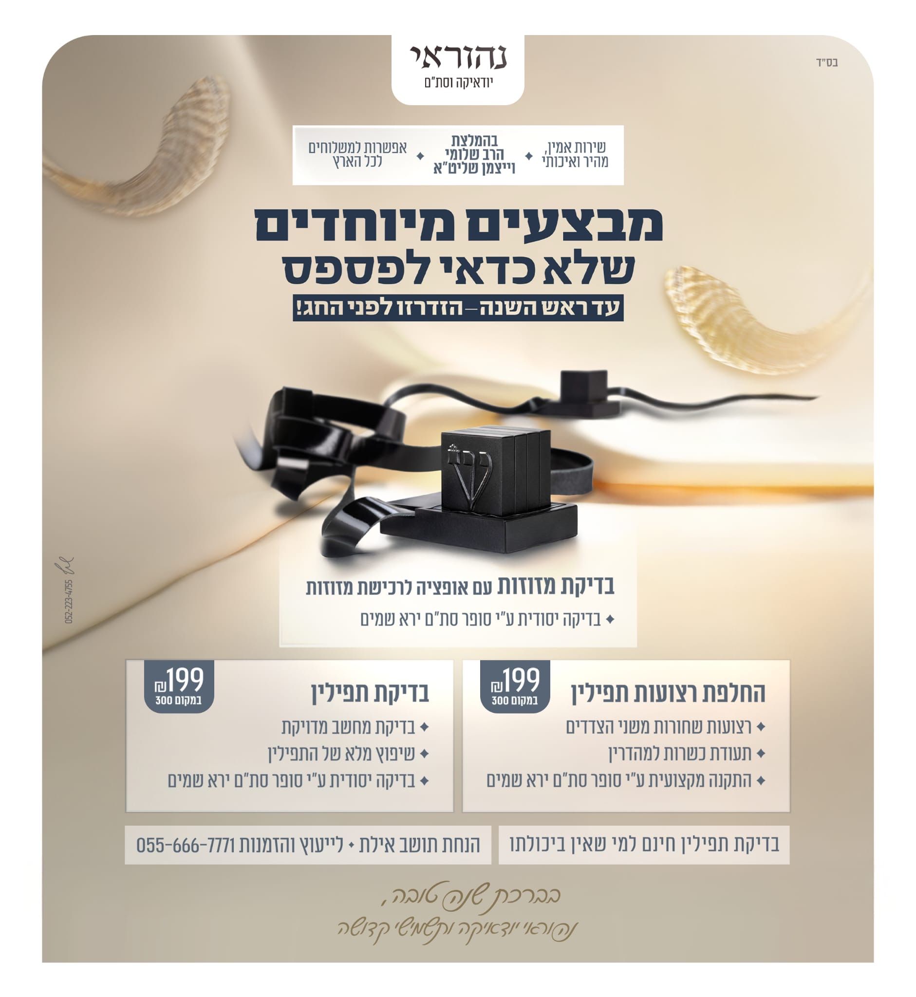 בס״ד אודות נהוראי –תשמישי קדושה יודאיקה וסת״ם בעסק “נהוראי – יודאיקה וסת״ם” 40 שנות ניסיון על ידי מור אבי בירושלים כתיבה של למעלה מ 25 ספרי תורה אלפי תפילין ואלפי תפילין ומזוזות תשמישי קדושה ברמה הגבוהה ביותר: תפילין, מזוזות, מגילות וספרי תורה. כל הפריטים נכתבים ונבדקים בקפידה על ידי סופרים סת״ם יראי שמים, מתוך הקפדה על קדושה ומהודרות. בדיקת תפילין ומזוזות – בדיקה ידנית וממוחשבתהחלפת רצועות ותיקוני תפילין מכירת מזוזות ותפילין מהודרות במגוון רמות הידורעיצובים אישיים על קלף ברכת הבית, ברכת העסק, אשת חיל ועוד משלוחים מהירים לכל חלקי הארץ.